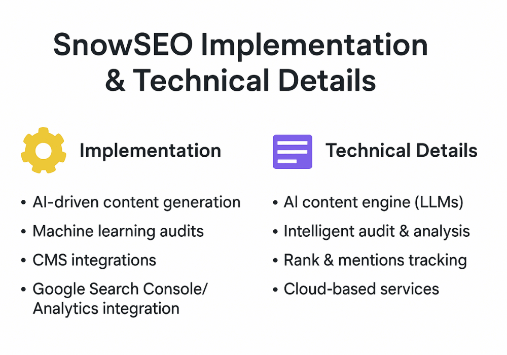 Integration & Data Pipeline SnowSEO integrates with popular CMS platforms for seamless publishing and likely connects with Google Search Console/Analytics for data syncing.